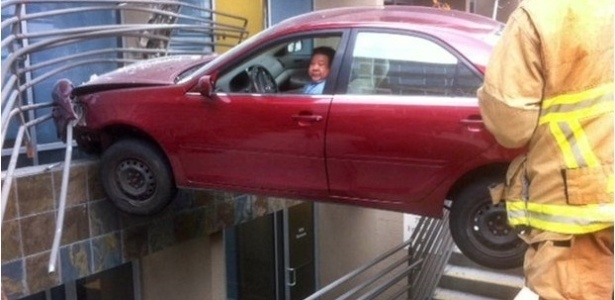 Segundo uma mulher que saía do prédio logo após o acidente, o homem não percebeu que estava suspenso no ar e tentou sair do veículo, mas foi impedido por ela.
